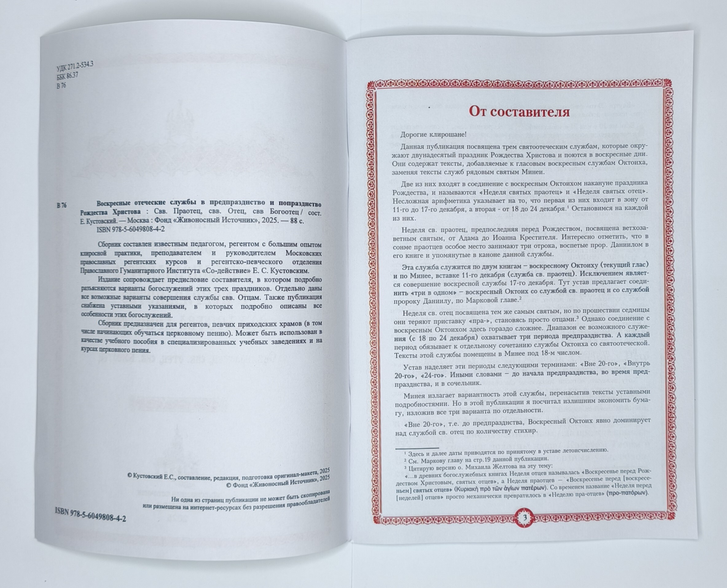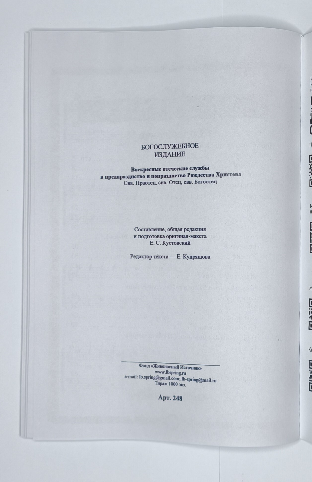 Арт. 248. Воскресные отеческие службы в предпразднство и попразднство Рождества Христова: Свв. Праотец, свв. Отец, свв Богоотец / сост. Е. Кустовский. — Москва : Фонд «Живоносный Источник», 2025. — 88 с., брошюра.