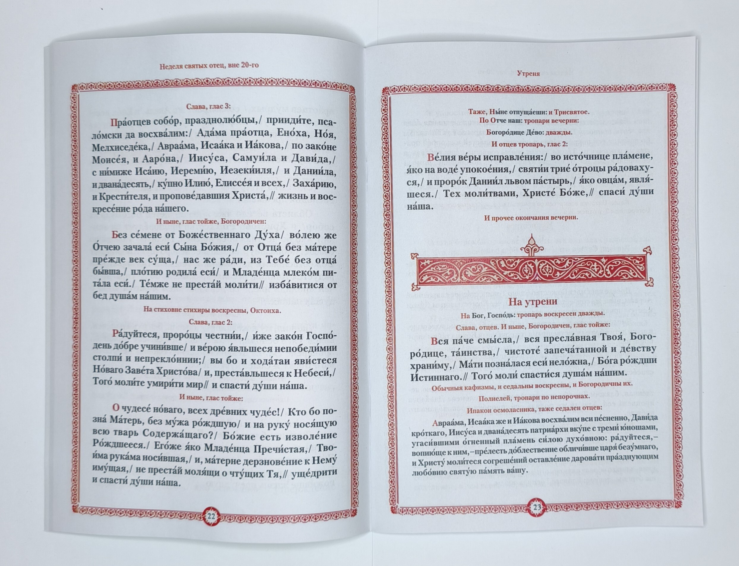 Издание сопровождает предисловие составителя, в котором подробно разъясняются варианты богослужений этих трех праздников. Отдельно даны все возможные варианты совершения службы свв. Отцам. Также публикация снабжена уставными указаниями, в которых подробно описаны все особенности этих богослужений.